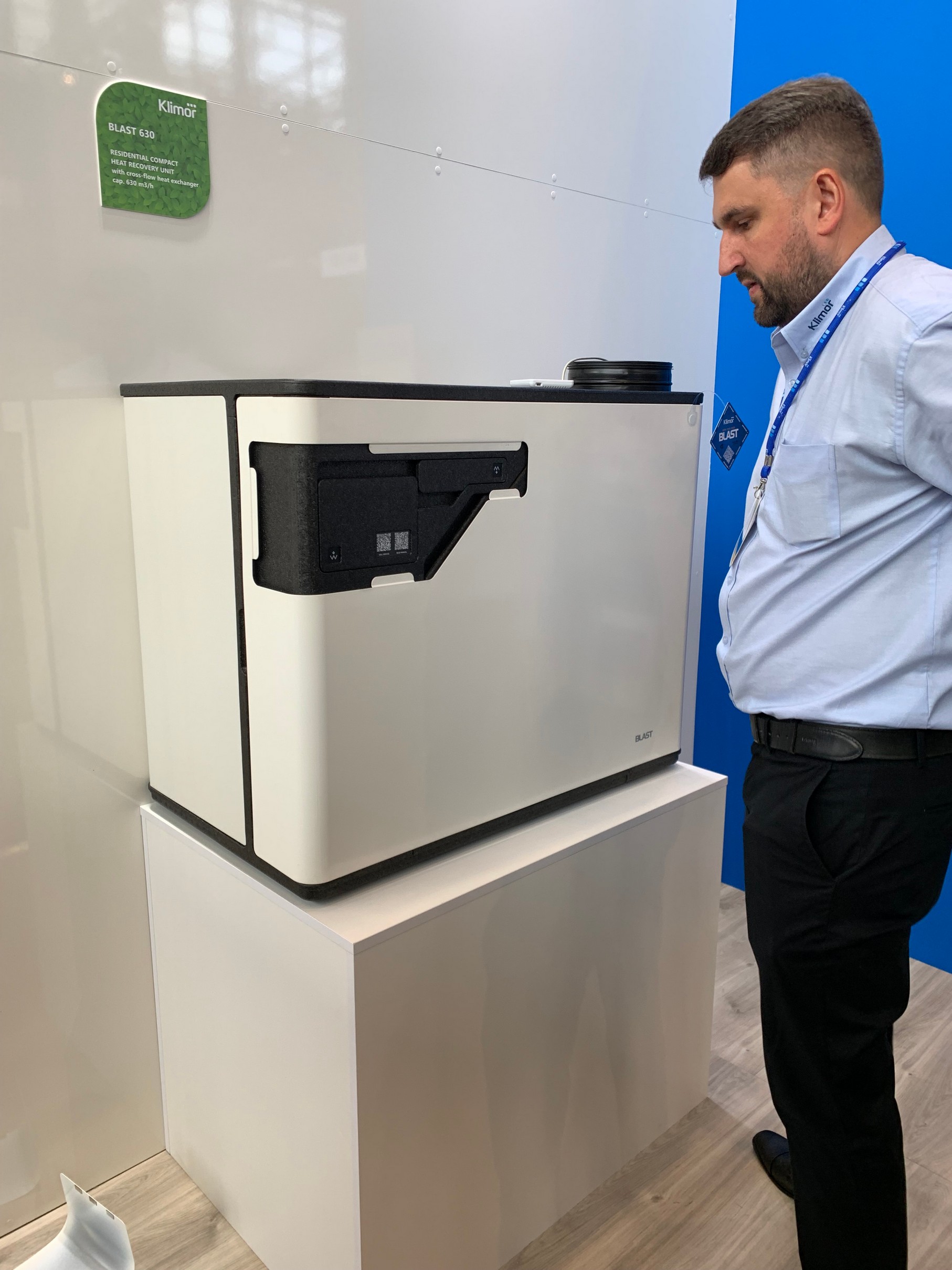 Klimor präsentierte eine Reihe von Kompaktgeräten für gewerbliche und private Anwendungen. Darunter auch das EVO S-Compact Lüftungsgerät mit hocheffizientem Plattenwärmetauscher, basierend auf einer Skelettbauweise mit Magnelis-beschichtetem Blechgehäuse. Die Gruppe der Wohnungsbaulösungen war mit zwei Plug&Play Ready-Produkten vertreten: dem hängenden Lüftungsgerät EVO-T+ für die Installation in der Zwischendecke und einer Neuheit, die Ende 2022 auf den polnischen Markt kommen wird - dem BLAST-Rekuperator. BLAST ist ein Gerät, das auf einer EPP-Konstruktion basiert, mit einem Gegenstrom-Wärmerückgewinnungstauscher, einem WiFi-Modul als Standard und Platz in der Zuluft für zwei Luftfilter. Der Rekuperator ist mit einem innovativen System zur Verhinderung des Vereisens des Wärmetauschers und einem Energieverbrauchsmesser ausgestattet.