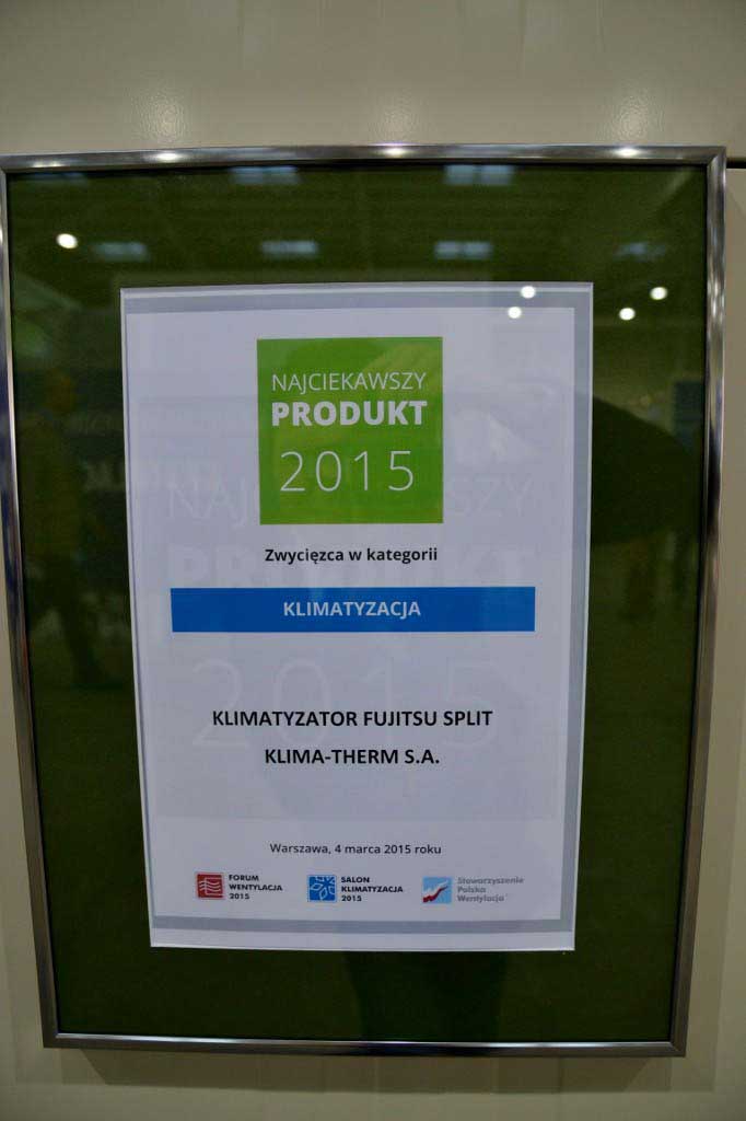 13th edition of ‘Forum Wentylacja – Salon Klimatyzacja’ - the biggest annual meeting of the HVACR trade in Poland, held between 3rd and 4th March in Warsaw, brought KLIMA-THERM an incredibly important distinction awarded by the circles of the trade. The visitors to the exhibition voted the Fujitsu Split Cassette AHU with circumferential air supply ‘the Best Product in 2015’ from among 14 devices entered for the competition in the ‘Air Conditioning’ category.