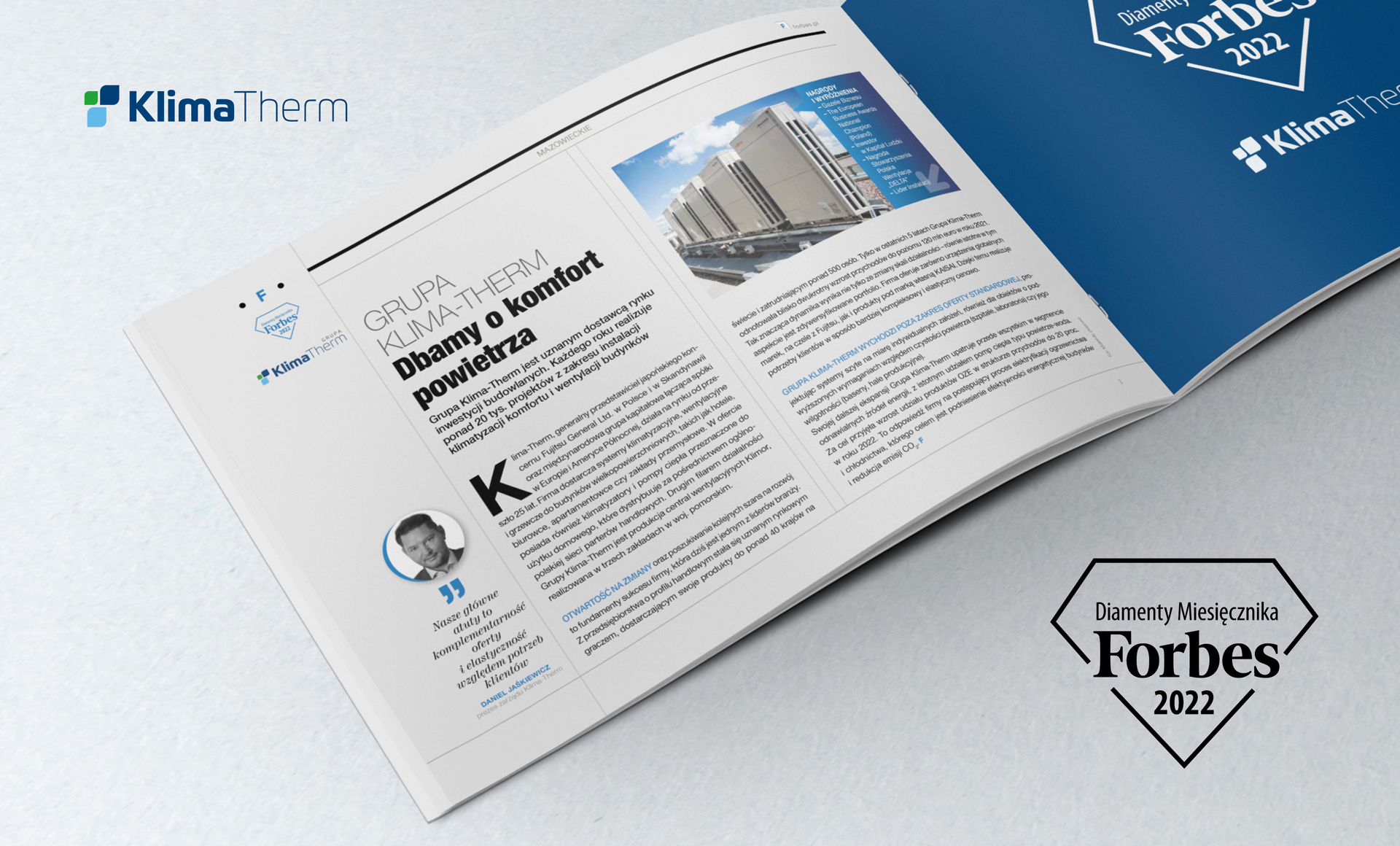 A list of companies – winners of "Forbes Diamonds 2022" was published in a special report in the January issue of the Forbes monthly and on the website: https://www.forbes.pl/diamenty/2022. This year's "Diamond" is the third one in Klima-Therm Group's history – the first one was won by Klima-Therm in 2013, and in 2018 Klimor was named as the winner.