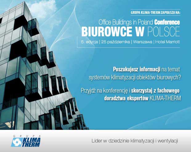 Już 25 października firma zaprasza na 5. edycję konferencji „Biurowce w Polsce” (Warszawa, hotel Marriott) – spotkanie dedykowane beneficjentom rynku obiektów biurowych. Program merytoryczny wydarzenia, realizowany pod hasłem „Czekając na powrót koniunktury”, uwzględnia prezentacje najnowszych analiz i prognoz, jak również stwarza doskonałą okazję do panelowej wymiany doświadczeń. Obecni na miejscu przedstawiciele KLIMA-THERM odpowiadać będą na pytania związane z doborem systemów klimatyzacji komfortu w budynkach biurowych.
